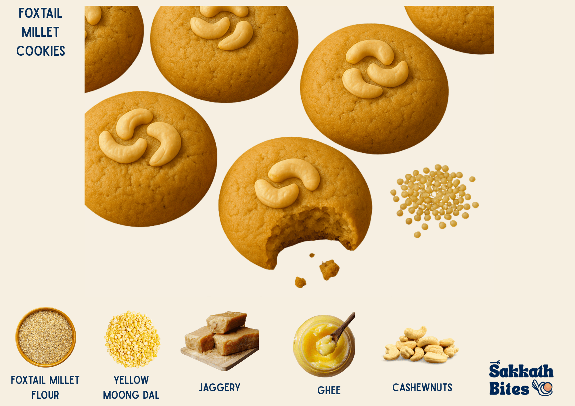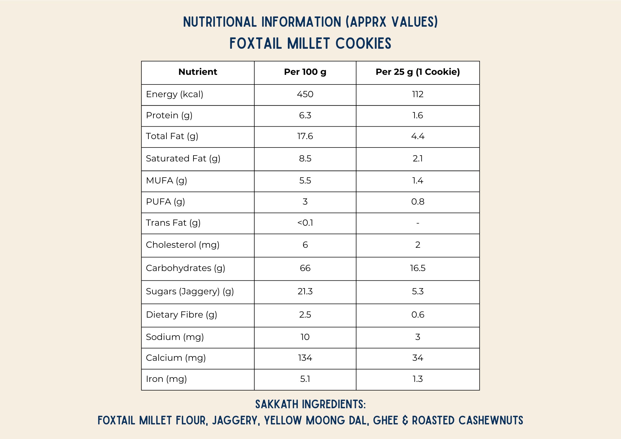 Crafted using foxtail millet and sweetened with jaggery, these cookies offer balanced nutrition with a satisfying crunch. Baked fresh without refined flour or artificial ingredients. A clean millet cookie made for modern lifestyles.